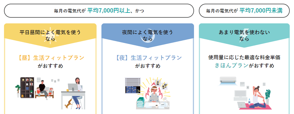 また、電気を使う時間帯に電気代がお得になる「生活フィットプラン」があのるで、以下のように生活スタイルが決まっている方におすすめ。