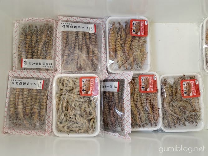 ショップの冷凍庫の中には、冷凍車えびが入っています。